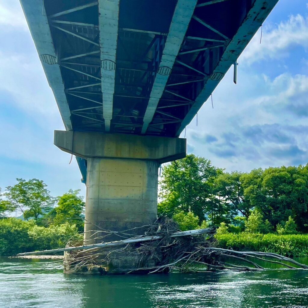 橋の下でみつけた夏の風景 青空が広がるある日、川沿いを散歩していると、一つの橋の下にたどり着きました。コンクリートの橋脚に大きく絡みつく流木が、自然と人工物のせめぎ合いを物語っているようです。水面には青空と木々の緑が映り