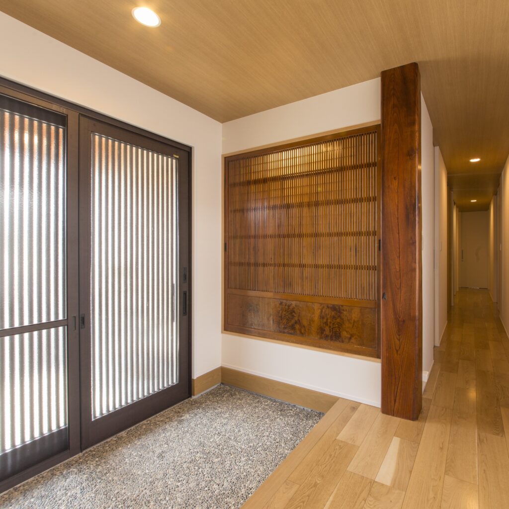 古民家の欅柱と千本格子建具建具の再利用 古民家の魅力を未来へ ― 欅柱と千本格子建具の再利用 今回ご紹介するのは、古民家の歴史ある素材を巧みに活かした事例です。玄関を入るとまず目を引くのは、立派な欅(けやき)の柱。長い年